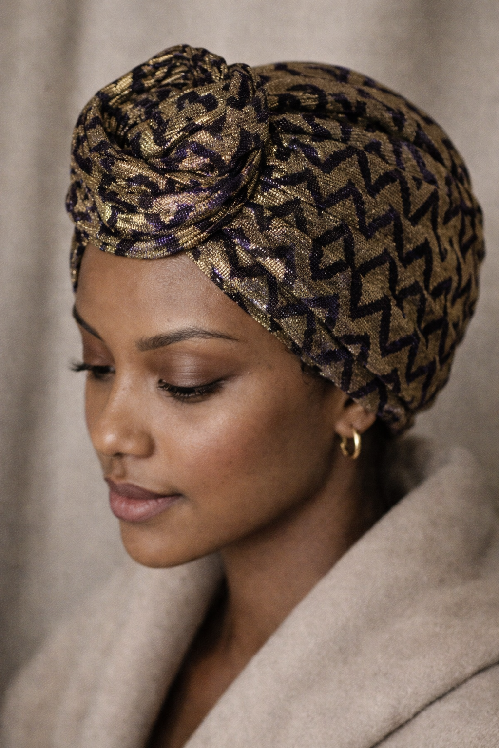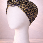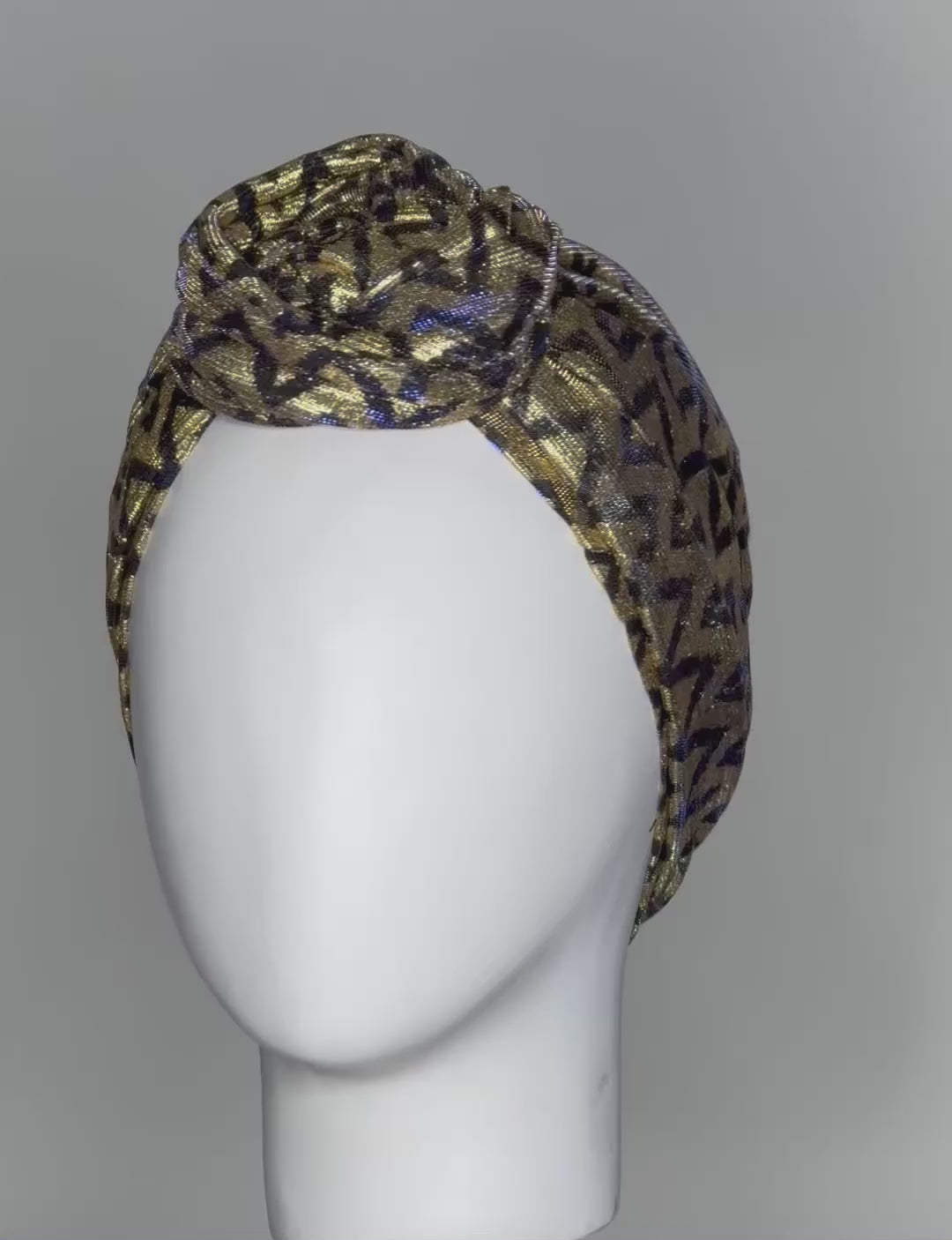 This turban is a unique design made from metallic lace.