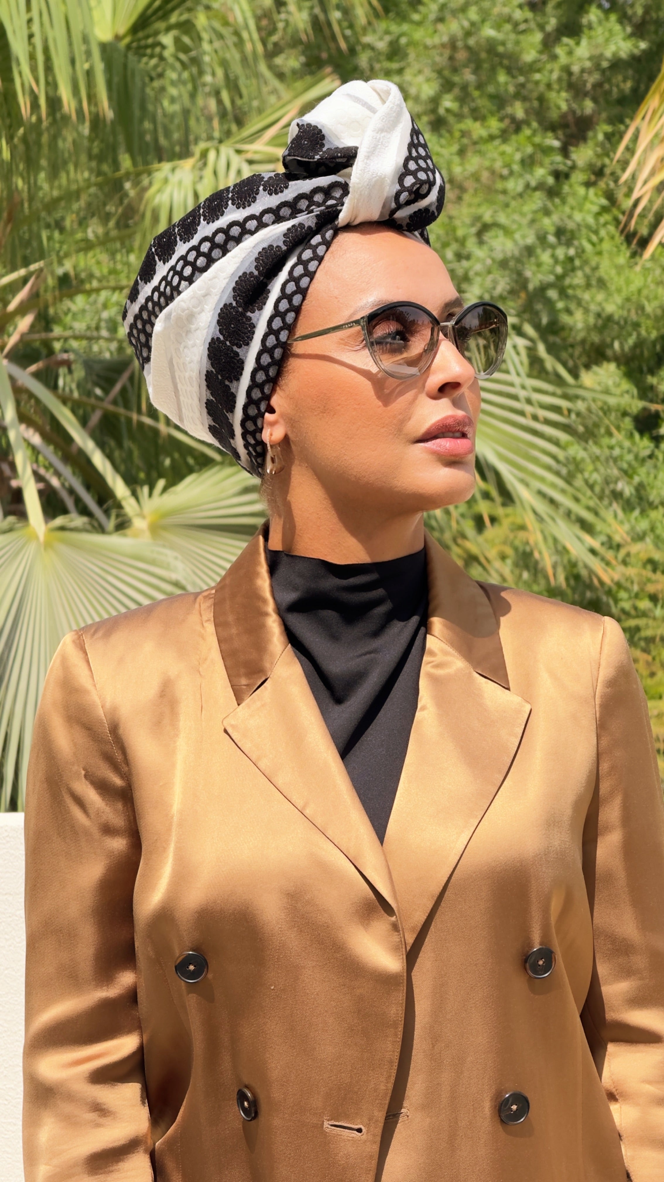 Because of its embroidered velvet finish, this turban has a more structured feel and is best suited for women who enjoy experimenting with creative headwear styling.
