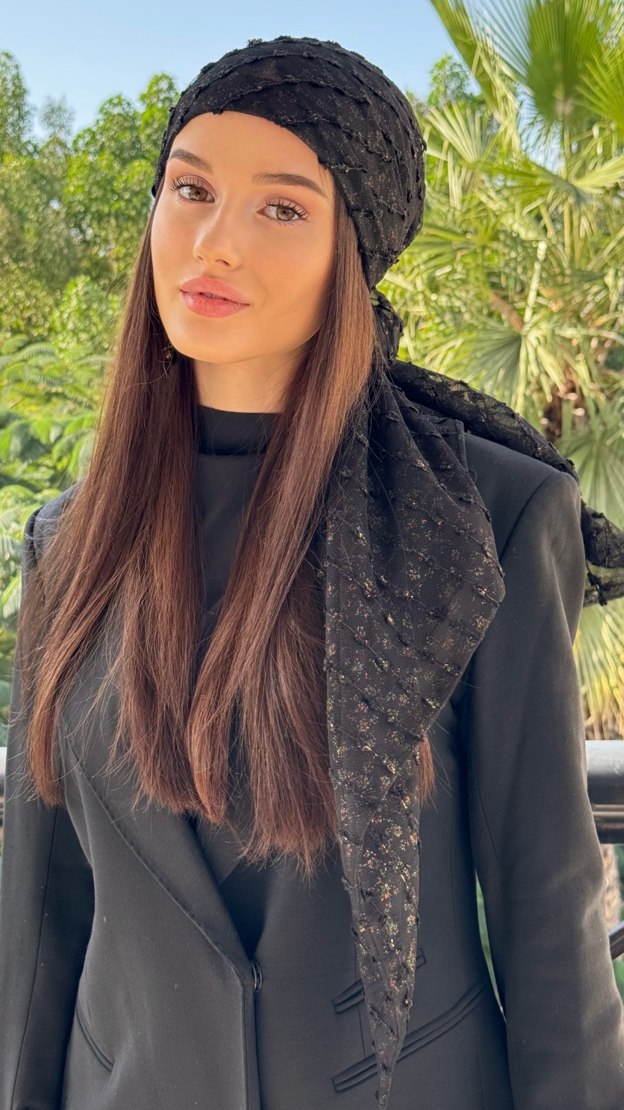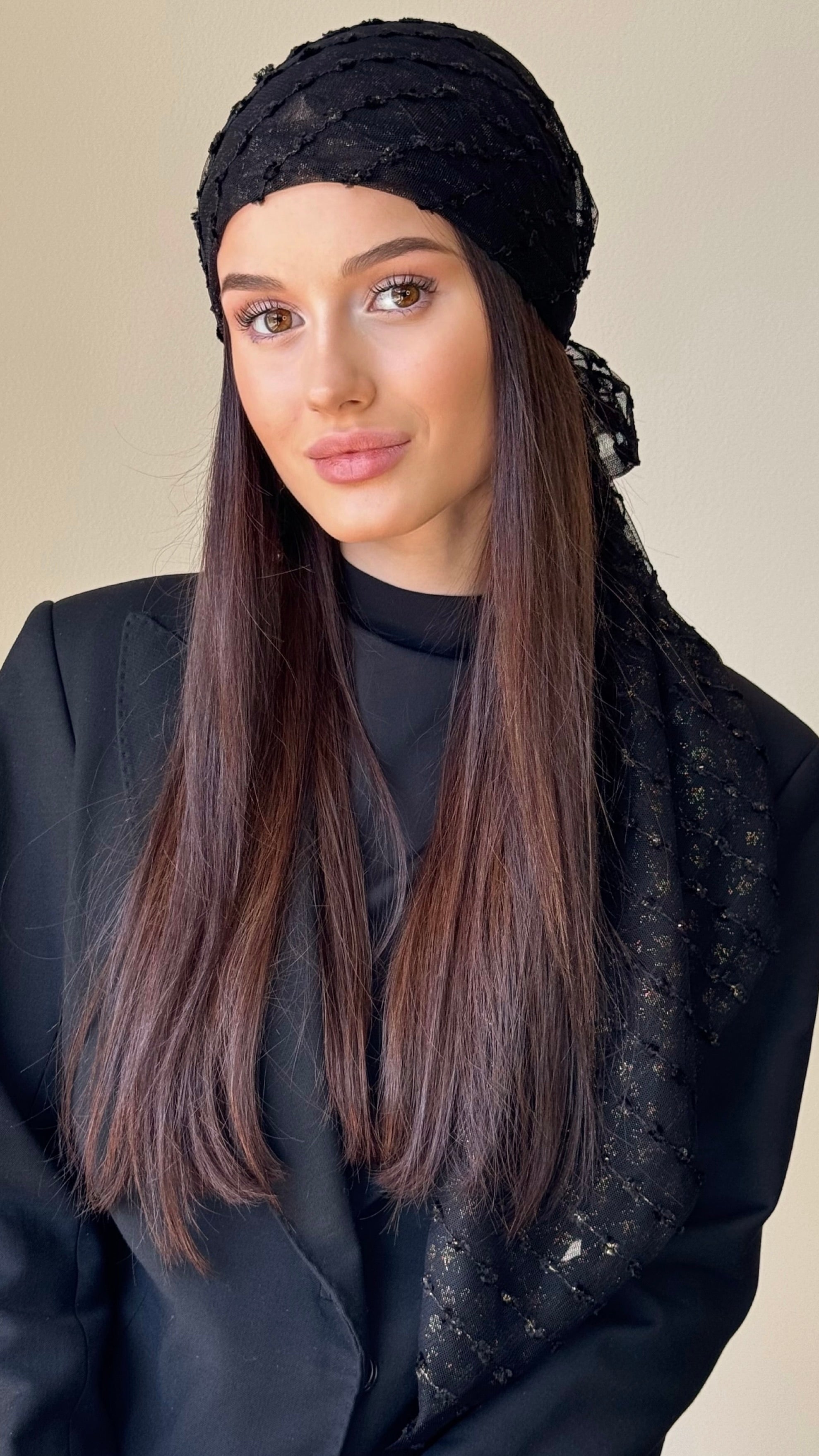 Discover our Black Lace w/ touch of gold headscarf-turban, an elegant accessory designed for women seeking both style and comfort. Whether you're a fashion enthusiast or embrace modesty chic, this turban fits perfectly with your needs. It is ideal for those experiencing alopecia or undergoing chemotherapy, offering soft and chic coverage.