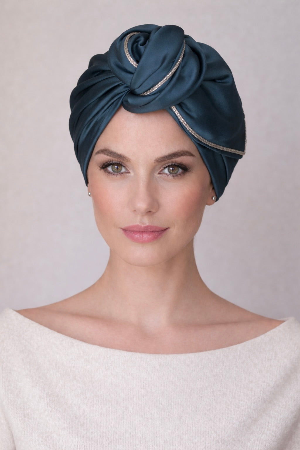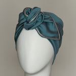 Rania turban crafted from silk, featuring a sculpted twist that creates soft, elegant shape. Finished with delicate silver beige sfifa piping along the edges, adding a subtle refined contrast.